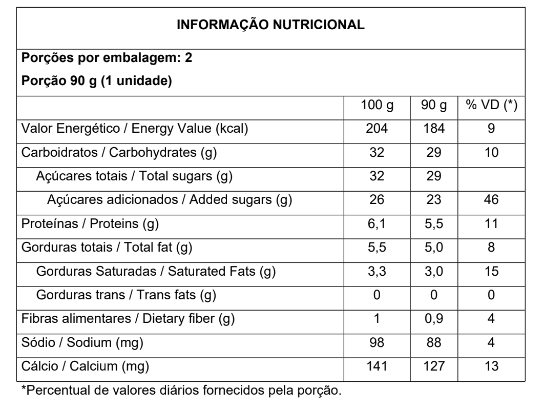 Leite integral, leite condensado semidesnatado (leite semidesnatado, açúcar e lactose), ovo pasteurizado, açúcar e cacau em pó.