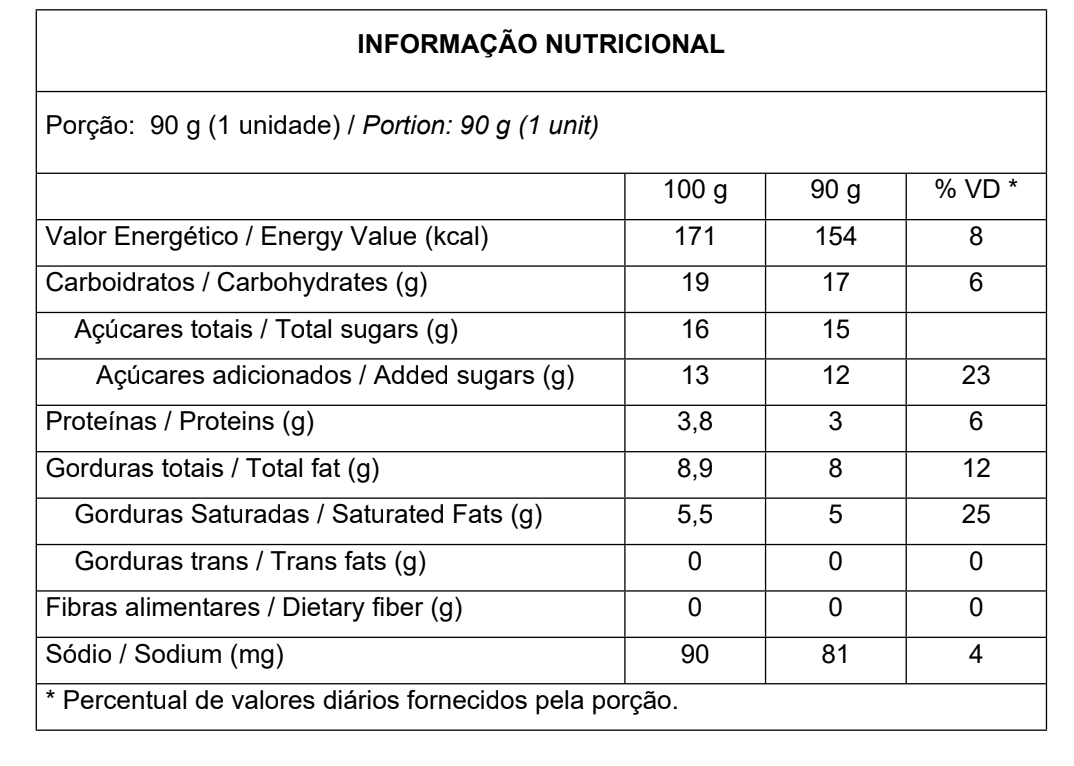 Leite reconstituído integral e/ou leite integral, xarope de açúcar, creme de leite, amido modificado, cacau em pó, açúcar, amido, corante caramelo IV, espessantes gelatina e carragena, reguladores de acidez hidróxido de potássio e hidróxido de sódio e estabilizante citrato trissódico. Ingredientes da cobertura: creme de leite, leite reconstituído integral e/ou leite integral, xarope de açúcar, açúcar, espessantes gelatina, goma guar e goma xantana e reguladores de acidez hidróxido de potássio e hidróxido de sódio.